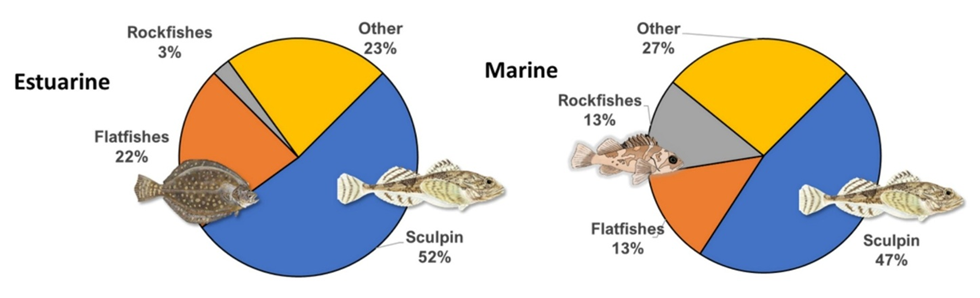 Unsurprisingly, the types of prey available to predators can vary greatly with a predator’s foraging habitat. This is something we can begin to examine ourselves in those species with lots of observations. A preliminary look at our data show that the most common prey item for Pigeon Guillemots along the Oregon Coast is sculpin (Family Cottidae), shown below in Figure 3 in blue. However, it’s interesting to note that the secondary prey of Pigeon Guillemots varies by habitat; in estuarine areas like Yaquina and Tillamook Bays, guillemots are seen feeding on flatfishes 22% of the time. However, in marine environments like Haystack Rock, guillemots also feed frequently on juvenile rockfishes (Sebastes spp.). As our data set increases in size, we’ll be able to look into habitat-prey relationships for more species, and hopefully even track how these might change over time, as well.