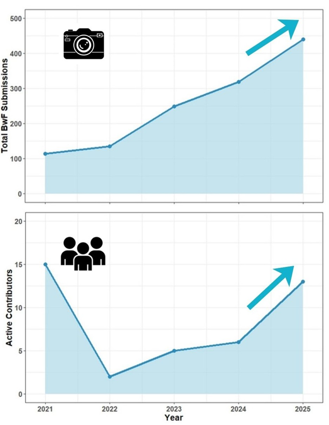 This year was a successful one for Birds with Fish, with the project receiving more than 130 new photo submissions in 2025. These new submissions represent a 35% increase in the size of our diet photo database (Figure 1) – not too bad for a single year! Of course, these submissions only come about thanks to our fantastic group of contributors. Happily, we’ve added eight new, active contributors to the Birds with Fish team during the year, increasing the size of our team. We’re hoping to increase participation further in 2026 and to reach even more nature lovers in Oregon, especially on the South Coast where we’ve so far received comparatively few submissions. Sharing a passion for Oregon’s coastal birds and habitats is a key part of the Birds with Fish program; this new year, we want to encourage you all to tell your friends about why birds and bird conservation are important to you!