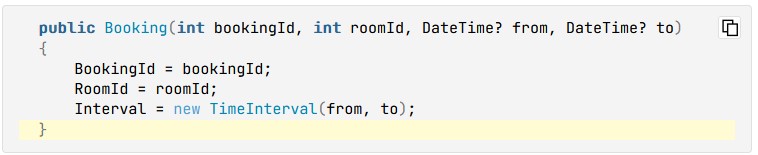 Here we have an example of an object that represents a booking aspect of a hotel. There are two different time parameters that are needed for the complete booking time. Splitting these two parameters away from the booking class and into a class of their own would make the code easier to read and maintain.