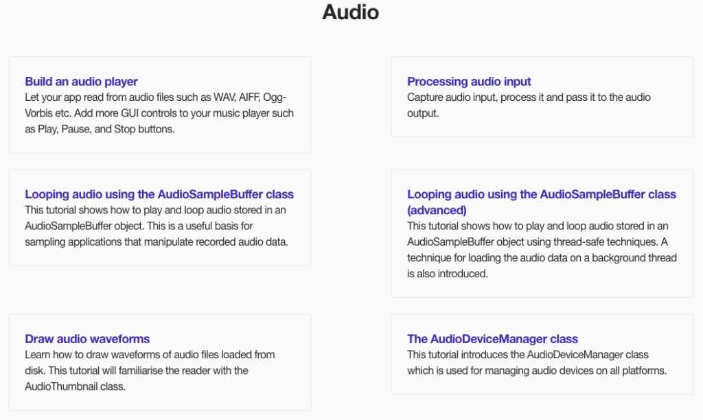 Another C++ Audio library we found was JUCE. JUCE boasts many of the same features as Superpowered, including audio I/O and audio looping. However, something I noticed that immediately makes it stand out above Superpowered is that these features are boasted in tutorials. In the below image, you can see tutorials that teach exactly the features I mentioned above. This will be essential for getting our feet off the ground, and will increase our pace of development.
