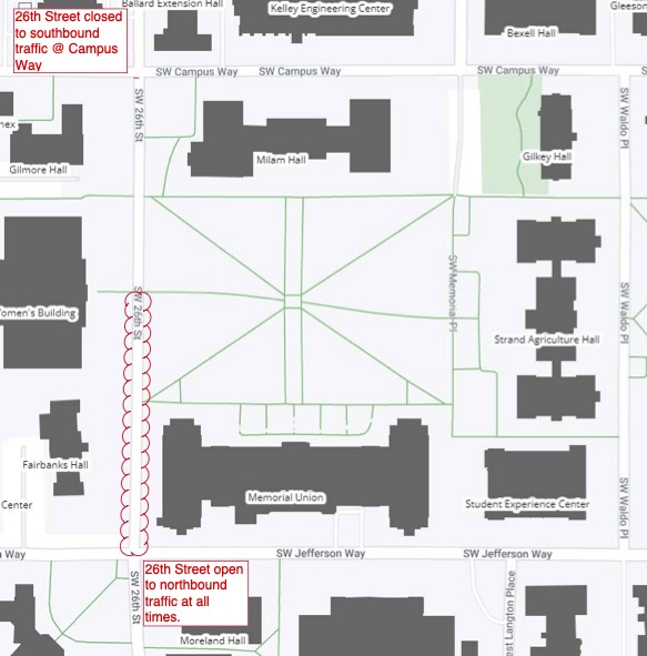 As part of the 2022 Street Safety Maintenance Project, the southbound lane of SW 26th Street between SW Campus Way and SW Jefferson Way will be closed for road improvements from May 11 through May 23rd. SW 26th Street will be open to northbound traffic only.