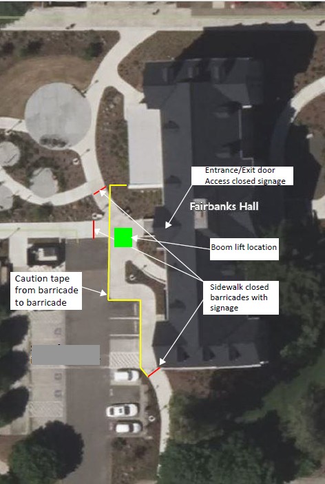 As part of renovation work happening at Fairbanks Hall, the west entrance and surrounding sidewalk area will be closed starting Monday, October 6 – Thursday, October 9. The closure will be in effect from 7:00 A.M. until 3:30 P.M. each day.
