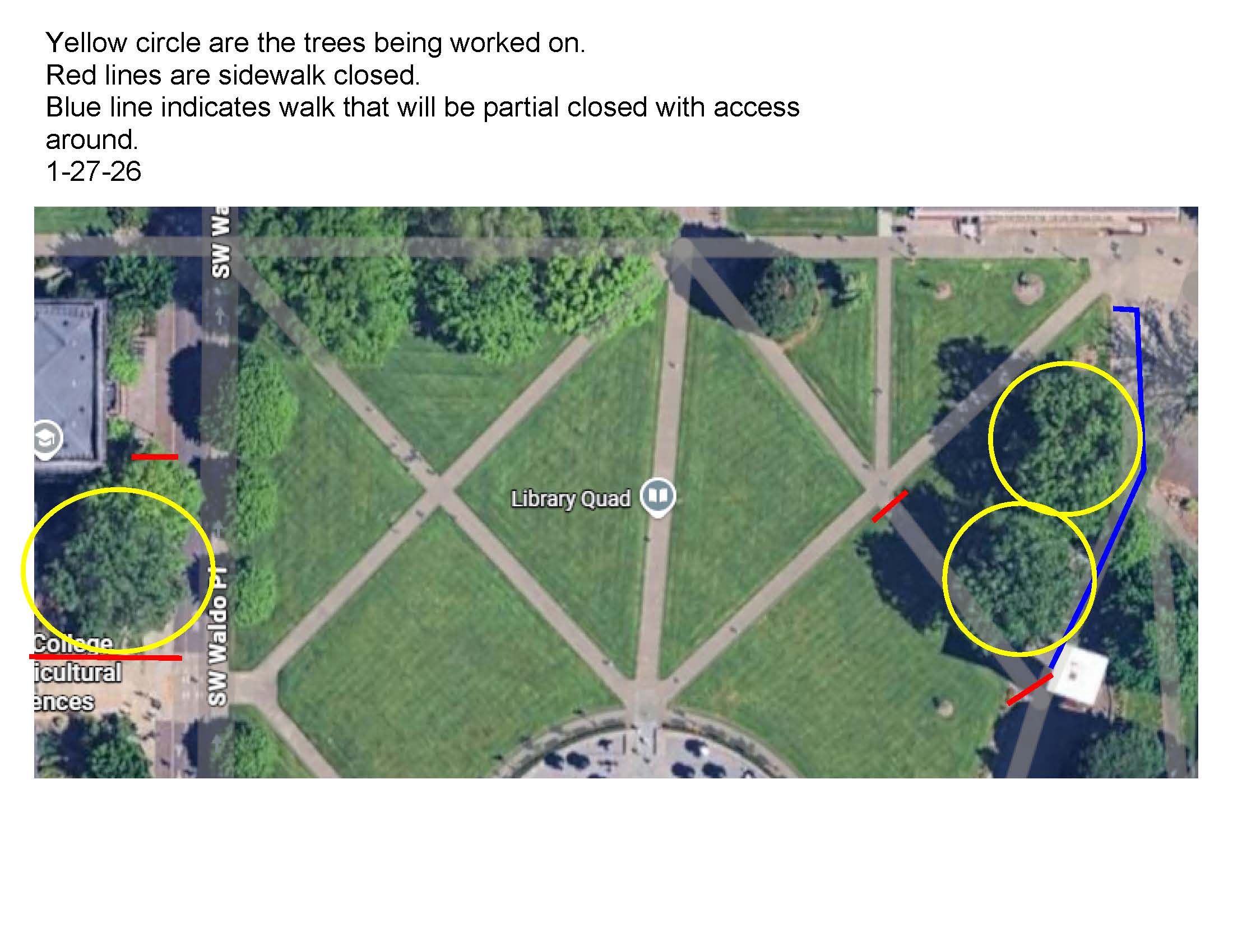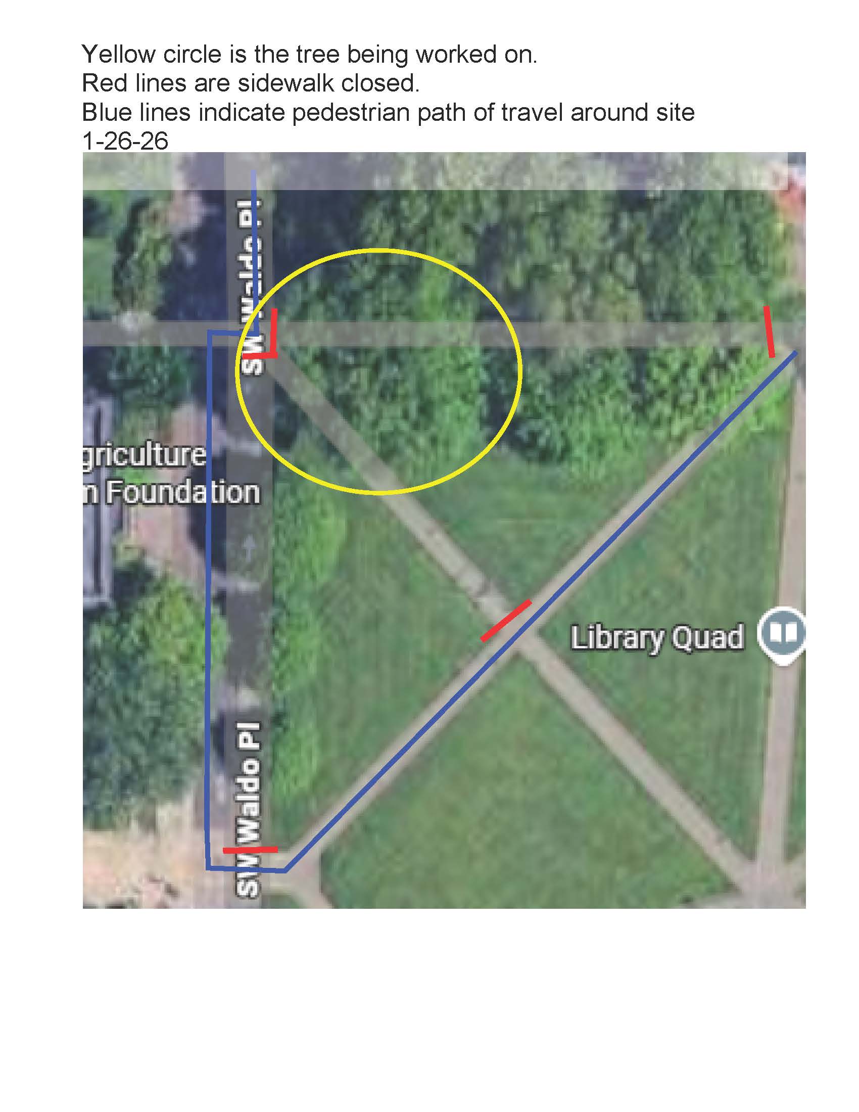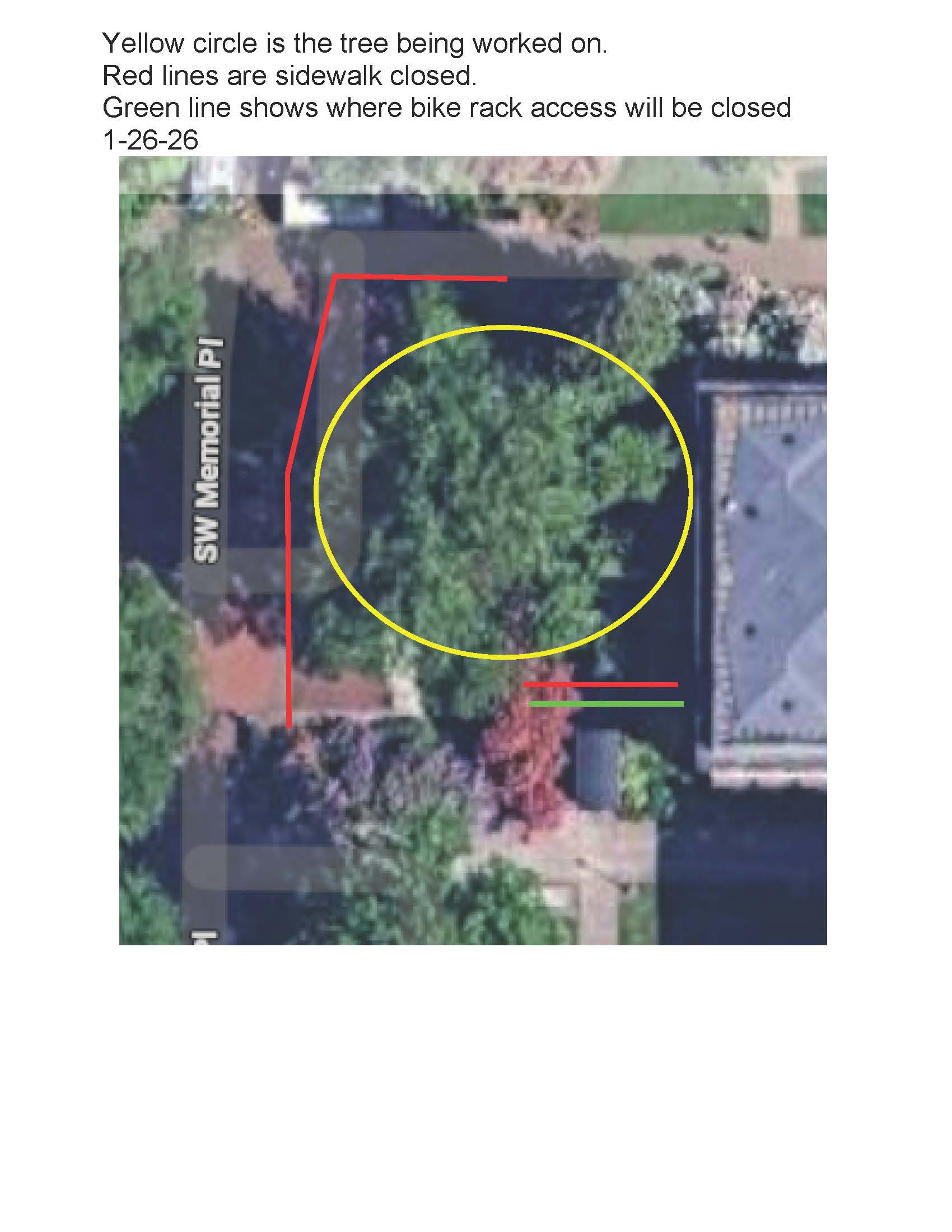 Due to contractor tree work being performed on the NW corner of Strand Ag. the red marked sidewalks will be closed for access and the green line shows the bike access that will be closed (see map) beginning Monday, January 26, 2026 from 7:00 am to 5:00 pm.
