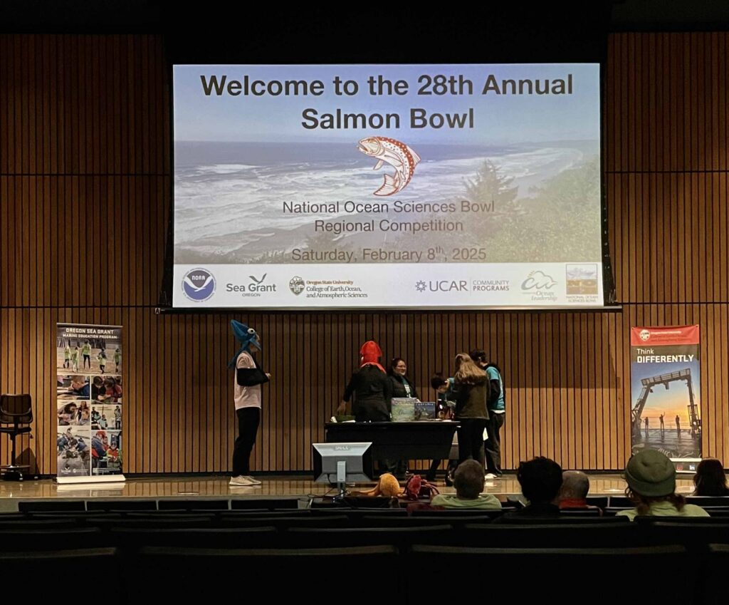 Emily A. and Eden volunteered as game officials at the 2025 Salmon Bowl, the annual regional competition hosted by OSU as part of the National Ocean Sciences Bowl (NOSB). The Salmon Bowl draws high school students from around the state to compete in a trivia-style competition based on all aspects of marine science. Emily acted as Moderator and Eden as Scorekeeper/Timekeeper for a full day of round-robin trivia matches and are looking forward to next season’s competition! Emily E. joined other faculty as a volunteer grader in 2024-2025 and enjoyed seeing students’ rich knowledge of interdisciplinary ocean science.