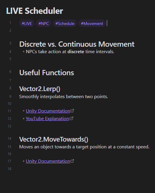 Frankly, my note taking is chaotic. I rarely revisit notes and mostly use note taking as an opportunity to put things into my own words or save resources. For example, I’m currently trying to get my NPCs to work in a game I’m making. There are a ton of options and it is simply to much to keep in my brain. So I made a short little note where I can drop thoughts or discoveries before moving on and risking forgetting. In my college courses I only take notes when I have a question, a “ah-hah” moment, or the lecture has value that cannot be easily researched after the class.