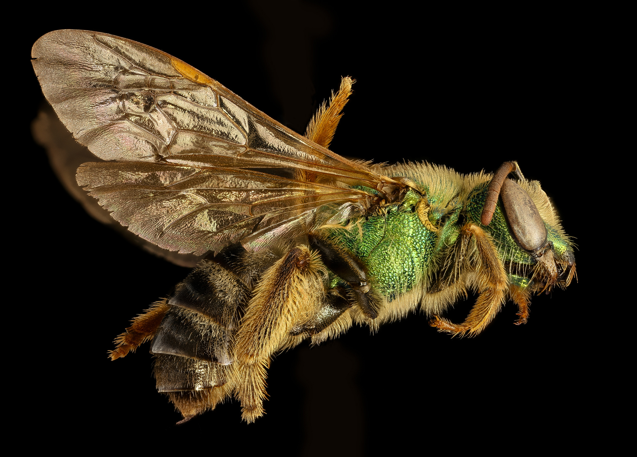 Halictus ligatus covered in pollen from the Morris Arboretum.