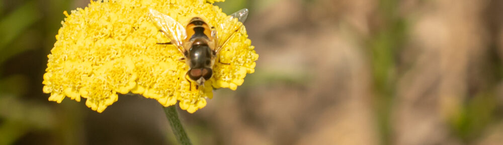 We have been seeing syrphid flies (family: Syrphidae) in great abundance this summer over at the Garden Ecology lab’s research garden, so much so, that our field research team has begun to call it the year of the syrphids! These bee-mimicking, skittish pollinators have particularly loved the native and cultivar yarrow we have planted in our plots. Although their abundance has recently dipped–likely because Yarrow (Achillea millefolium) is done with its first round of bloom–we still see them buzzing around.