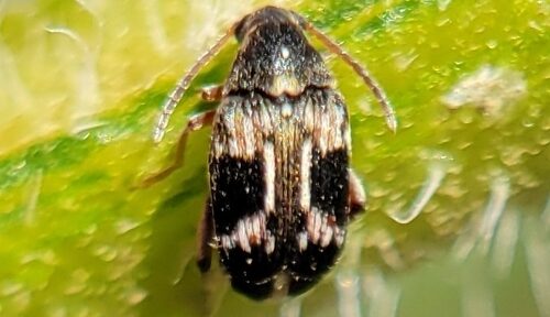IMAGE DESCRIPTION: A Cowpea weevil, which has long antennae and brown and white spots on its elytra. Female cowpea weevils are known to mount other female cowpea weevils. Photo © Gene H on iNaturalist.