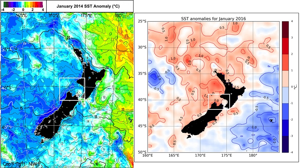 Figure 3. Comparison of sea surface temperature (SST) anomaly plots of the New Zealand region between January 2014 (left) and January 2016 (right). The white box in both plots denotes the general location of our blue whale study region. (Apologies for the different formats of these plots – the underlying data is directly comparable.)