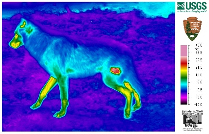 Figure 4: Wildlife monitoring: detection of mange infection in wolves of Yellowstone National Park. During winter, wolves infected with mange can suffer a substantial amount of heat loss compared to those without the disease, according to a study by the U.S. Geological Survey and its partners.