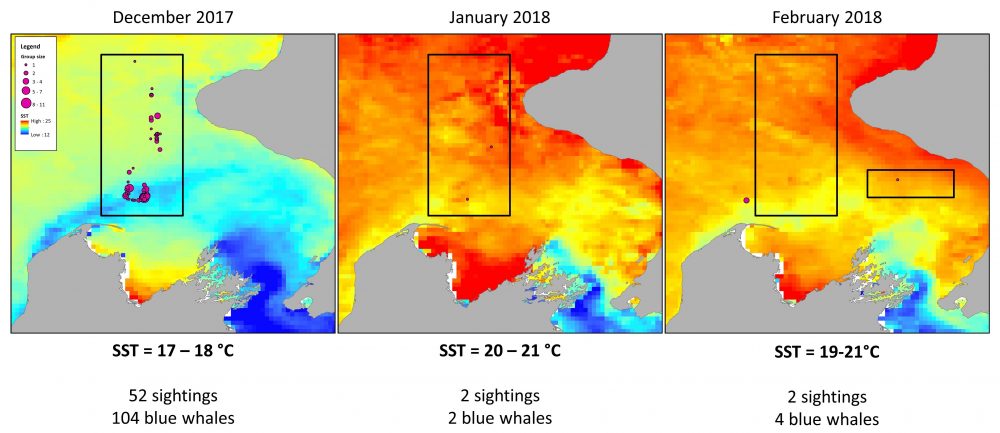 Monthly sea surface temperature (MODIS Aqua) overlaid with blue whale sightings from marine mammal observers aboard seismic survey vessel R/V Amazon Warrior. Black rectangles represent areas of seismic survey effort. Blue whale sightings were provided by RPS Energy Pty Ltd & Schlumberger, and Todd Energy.