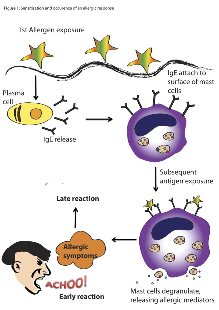 Previous ImageNext Image mast cell reactoin Basic cartoon of an allergic reaction from exposure to the allergen to the reaction from the animal. (Image Source: Scientific Malaysian)
