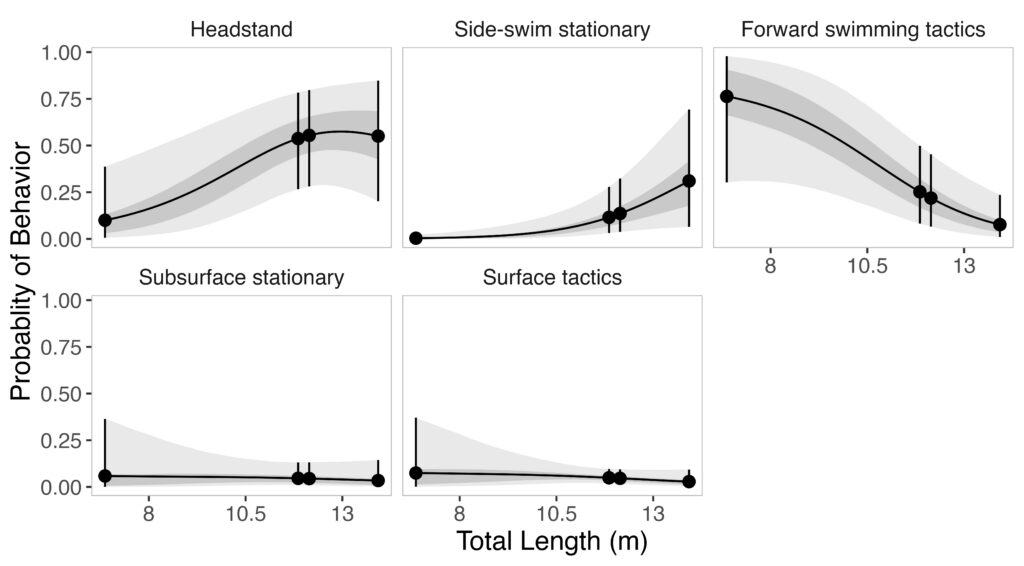Given the impressive diversity of foraging tactics used by PCFG gray whales (Torres et al., 2018), a central question from the start was, “do all individuals use all behaviors, or is there variation in which whales use each behavior?”. This interest in individual specialization led to several blogs and became the question I asked in my first PhD chapter (read an introduction to specialization here and summaries of the drivers of specialization here and here). In my first chapter, I used drone data to study the relationship between individual behavior use, body length and condition, and habitat type. We found a strong relationship between foraging behavior and individual length (which is also a proxy for age). Longer, older, whales were more likely to feed using the headstanding tactic while shorter, younger, whales were more likely to feed using forward swimming tactics (Figure 1; Bird et al., 2024a). Together, these results suggest an ontogenetic shift (i.e., a shift associated with age) in foraging behavior use. Furthermore, we found that different tactics were more likely to be used in different habitats; headstanding was more likely to occur in reef habitats while the forward swimming tactics were more likely to occur in rock habitat. Overall, this chapter showed us that PCFG gray whale foraging behavior varies by length/age and habitat, indicating a lack of generalization across the group.