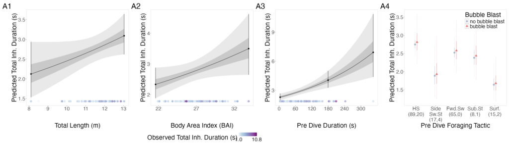 The interpretation of results from my first two chapters involved many questions regarding energetics. As we’ve described in previous blogs (here and here), it is important to understand how much energy different behaviors require because energetics helps us understand foraging success. Following the results of my first chapters, we wanted to better understand if different foraging behaviors cost different amounts of energy and if bubble blasts affected the energetic cost of a dive. To ask these questions we used individual breathing patterns as a proxy for energy expenditure (read more on the method here) and explored how breathing patterns were related to individual length, body condition, and behavior (including dive duration, foraging tactic, and bubble blast use). We found that the energetic cost of a dive increased with individual length, body condition, and dive duration (Figure 3.A1-3). Interestingly, we found no relationship between foraging tactic, bubble blast use and energetic expenditure (Bird et al., 2025; Figure 3.A4). However, my second chapter showed that both foraging behavior and bubble blast use affect dive duration (Bird et al., 2024b), indicating that effects of behavior on energetics come via the dive duration variable.
