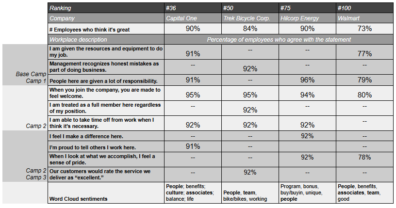 As you can see in the table below, the themes I drew from employee sentiments at Capital One, Trek, Hilcorp, and Walmart align with these “camps,” supporting two arguments made by Marcus and Buckingham: first, that across companies and industries, what drives employee engagement and productivity is consistent; and second, that the insights may be unexpected (Marcus and Buckingham, 22-24). You see far more insight about company culture and people than pay and benefits in the Fortune 100 list.