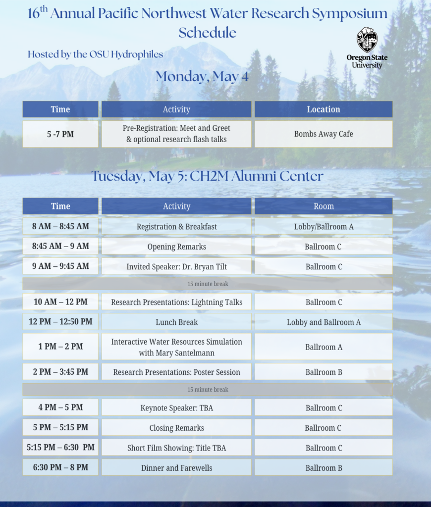 Hosted by the Oregon State University Hydrophiles, the Water Research Symposium is a one-day, student-centric conference highlighting outstanding student research in the fields of water resources science, engineering, and policy. This conference is free and open to anyone to attend. The 2026 Water Research Symposium will be held May 5th at the Oregon State University CH2M Hill Alumni Center! The theme of the 2026 Symposium is Connectivity: Water, People, and Ecosystems. Our programming will be focused on how water connects not only streams and ecosystems, but how it connects people to one another, and everything in between.