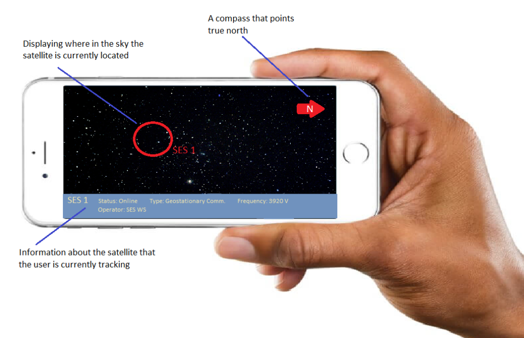 A few days ago, my team and I had our initial sponsor meeting. It was a good experience and demonstrated what working with a client will be like. The meeting was relatively informal, and the sponsor started the meeting by briefing us on what exactly satellite tracking with ham radios entailed, and what they were looking for with the app. The essential idea is that a user can view a list of satellites that are above the horizon (meaning they can be contacted); then they can select one of these satellites, the user’s camera will then be brought up and using AR, the app will display the general area where the satellite is in the sky so that the user then knows where they need to point their antenna to make contact. There will also be information specific to the selected satellite displayed for the user to view. Below is a simple prototype of what the AR screen could look like if the user is tracking the SES 1 satellite.
