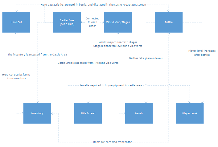 Having a design document to refer to is very important, as everything you need to know should be printed there. One of these things will be a model of how the game will be put together. Creating an accurate model to refer to will keep the game’s structure together. Here is a quick draft of what my game’s model looks like. It could probably be better, but it is just a draft and example: