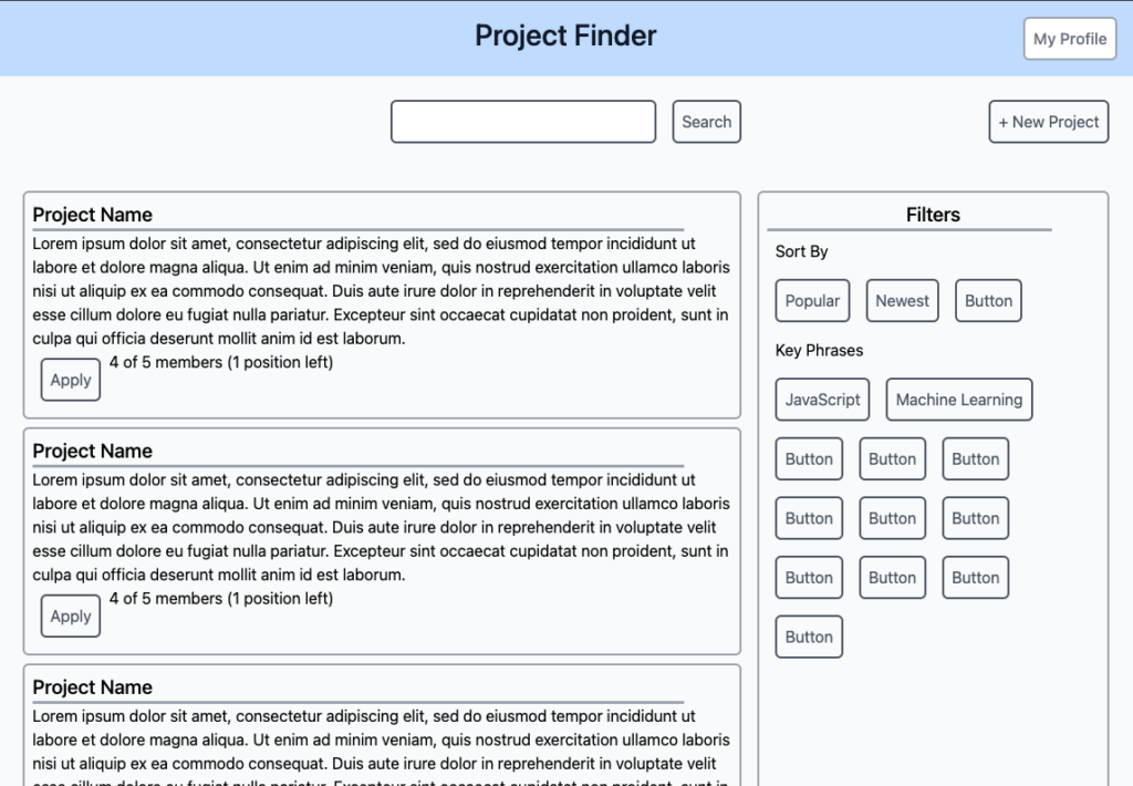 I looked into tools like Figma and LucidChart but ultimately decided to make the wireframes with HTML and CSS. I made this decision because I am trying to more quickly go through this step of the application development cycle, and thought I could prototype in HTML and CSS just as quickly as using other tools.