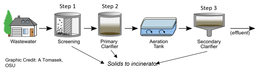 Modern wastewater treatment is a controlled process. Step 1 in the figure above is to screen the wastewater coming into the plant to remove solids. In the case of Aurora, those solids are hauled to Salem for disposal in the Energy to Waste Facility at Gervais. The cost of hauling and disposal is $9,000 per month. Food waste adds weight to the load and increases the cost of hauling.