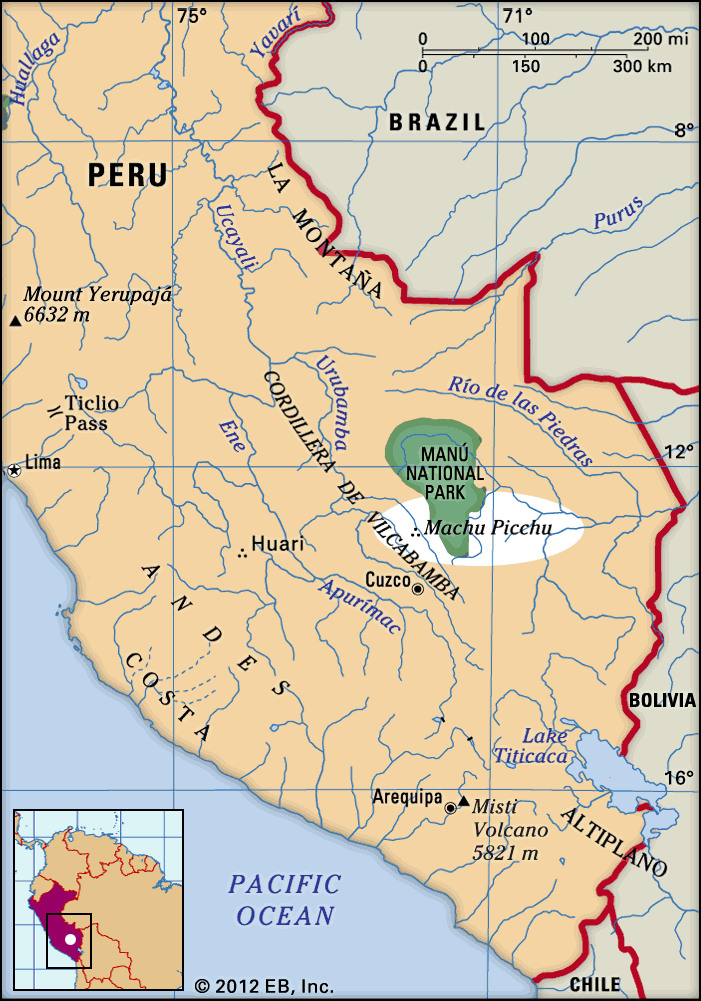 Machu Picchu is located in the Cusco region in southern Peru. It is situated in the Andes Mountains, reaching heights of just under 8000 feet. The Historic Sanctuary of Machu Picchu as a protected area covers 135 square miles, encompassing the Machu Picchu archaeological site (what you think of when you think of when you think of Machu Picchu) and the surrounding nature and environments (Wikipedia).