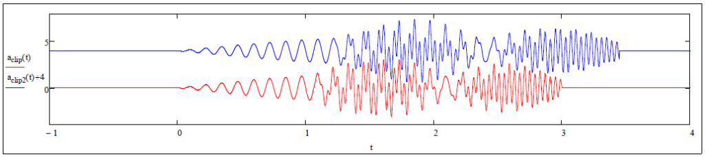 So how would Time Stretching be achieved?  The pic below shows an example of an audio file that is time stretched by 15%.  It is easy to see that the frequency in the beginning of the blue trace (stretched by 15%) has the same frequency as the red trace (peaks and valleys of the signals line up.  It is also pretty easy to see that end frequencies (pitch) is the same.  What does this do to Fourier transforms of the signal?