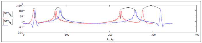 Below we show the magnitude of Fourier transforms for the above time signals.  We can see that the magnitudes at the peaks are similar, but the peaks of the longer time signal has shifted by roughly 15%.  This hint tells us how to transform an audio signal into a new time stretched, or crunched signal.