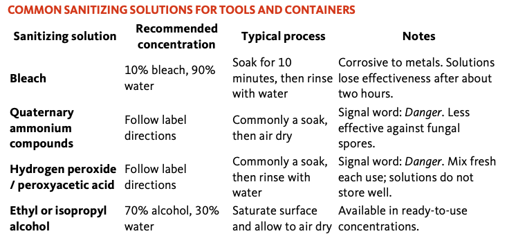 Several liquid solutions can be used to sanitize tools and containers. Many sanitizers are skin and eye irritants and must be handled carefully.