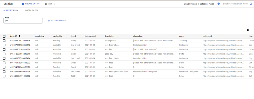 Unlike traditional databases, there wasn’t really a need to define a strong structure. GCP’s Datastore is essentially a NoSQL database that allows you to store anything you want with a key as the unique identifier. As you can see below, we ended up storing arrays, strings, dates. It is pretty flexible (but it also means that the application has to have the logic to maintain the consistency of the data)