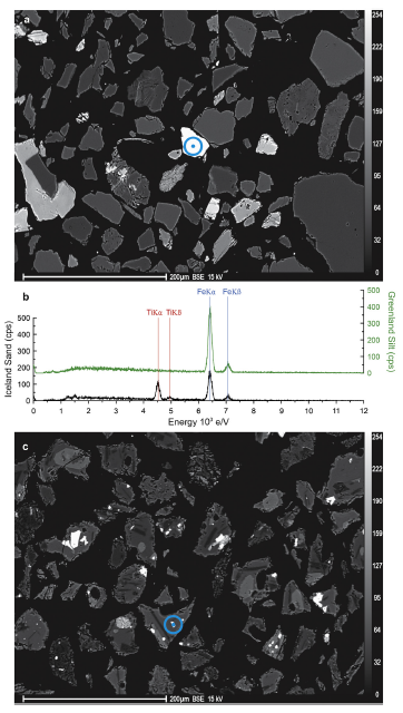 Figure 1: Backscatter electron images of river silts collected from Greenland (top) and Iceland (bottom). Fe-Ti oxides appear as the brighter regions due to their higher atomic numbers and are typically free magnetites in Greenlandic samples and included (titano-)magnetites in Icelandic samples. Rob Hatfield and colleagues in 2017 demonstrated how this difference can be used to better understand sediment source contributions to Northern North Atlantic sediments in their paper in Earth and Planetary Science Letters.
