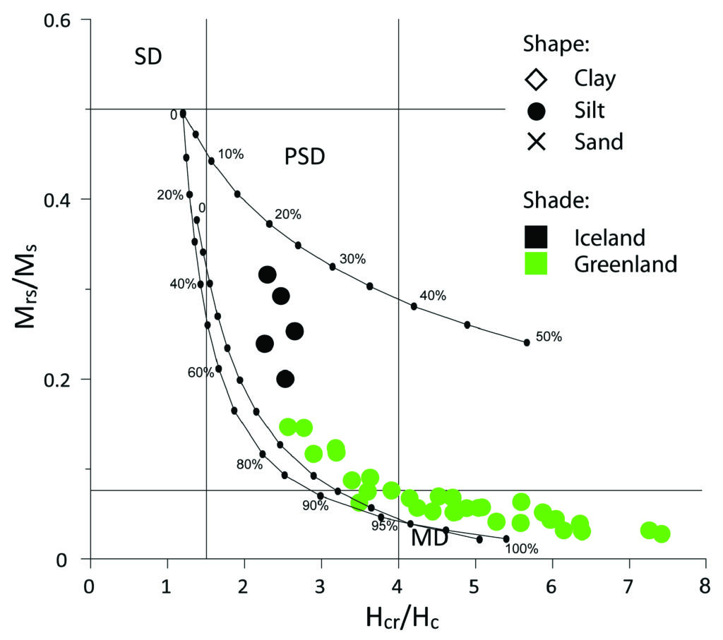 Figure 2: Day plot (after Day et al., 1977) of terrestrially derived silt (3-63 µm) from Greenland (green data) and Iceland (black data) to visualize the variation in magnetic grains size with source. Note that Icelandic silts possess relatively similar fine Psuedo-Single Domain (PSD) magnetic grain sizes. In contrast Greenland silts plot in a region consistent with coarser magnetic grain-size, likely reflecting differences observed using electron microscopy in Figure 1. All data from Rob Hatfield’s 2013 study in Earth and Planetary Science Letters.