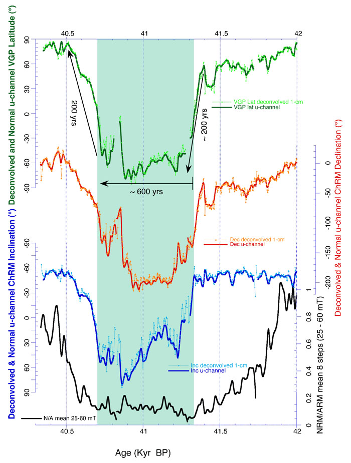 Figure 1. Blowup of deconvolved u-channel magnetic data through the Laschamp interval at ODP Site 1233. From top to bottom: VGP latitude based on deconvolved and regular u-channel data. ChRM declination and deconvolved declination. ChRM inclination and deconvolved inclination. Mean NRM/ARM as an RPI proxy.