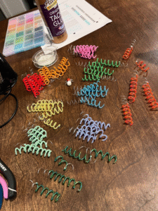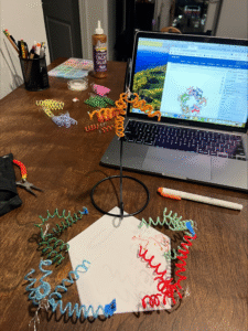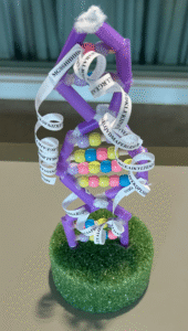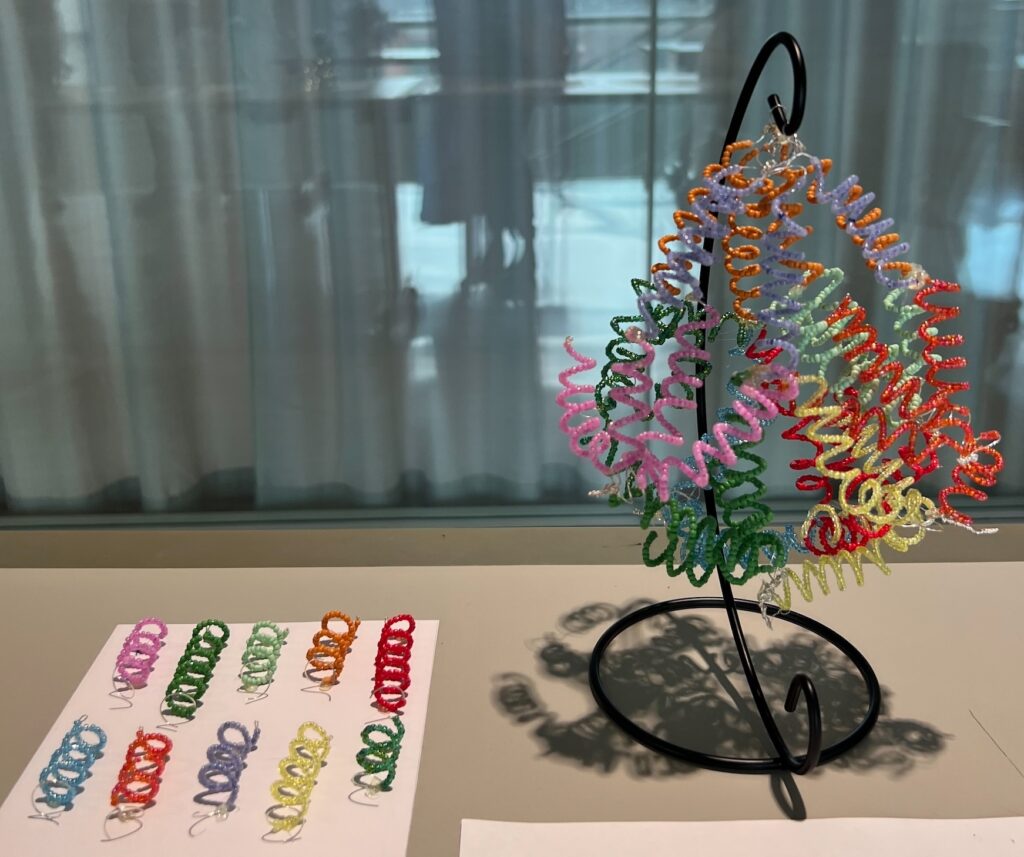 On the paper is the sequence of the protein, characterized by capital letters. Ultimately, DNA polymerase cannot operate without a DNA strand, hence its placement on the helix made out of pipe cleaners, straws, wooden dowels, beads, and lots of hot glue. The beads represent individual nucleic acids, while the straws make up the backbone of the DNA helix, filled with pipe cleaners to allow for flexibility.