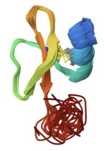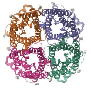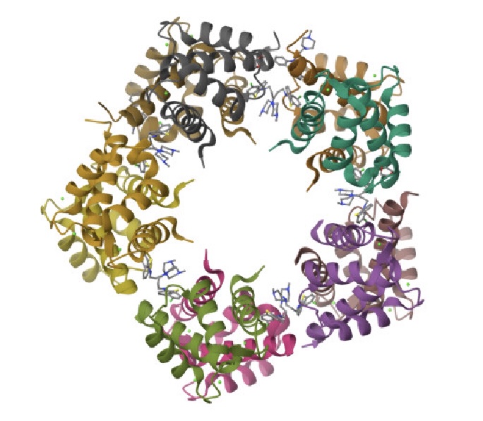 Due to it’s global symmetry (Dihedral -D5) structure, this protein stars as the “Portal to the Meta-Stasis”, through which the characters of this year’s protein portraits film traverse into a parallel universe, piercing the fabric of space and time where they fight their epic battle. To emphasize its portal-like structure and arrangement, I chose to artistically represent the 10 of the chains which are distinguished by different colored seed beads arranged on thin wire mostly comprised of the alpha helices.