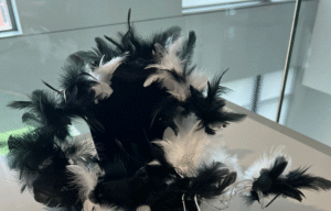 This wire feather boa represents the costume department for “Proteins at the Movies” as it translates the biological structure of feather keratin 4 into wearable art. By fusing science and style, Protein Plumage celebrates the elegance of nature at the molecular level by bringing the beauty of structural proteins to the spotlight.