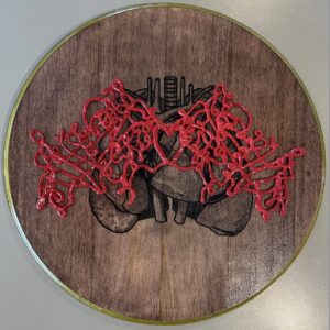 Angiotensinogen is a very important protein when it comes to sustaining life. It is a glycoprotein that is synthesized and secreted into the bloodstream by the liver. In a nutshell, it is the protein that helps regulate blood pressure and fluid levels. This portrait is representing the correlation between the protein and the cardiovascular system. It is in a gothic style to represent its role as one of the antagonists of the movie: a vampire. I wanted the drawing of the cardiovascular system to be in the style of old medical drawings. I decided to put in a thing of wood because I was inspired by old antique shops that sold plaques of various specimens. Finally I wanted the protein itself to be a dark read, representing the blood stream as well as the vampire movie it portrays.