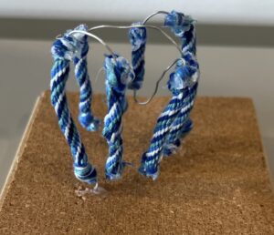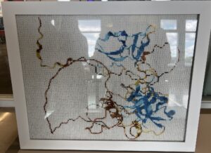In this sculpture, one of these monomers is constructed using a wire to depict the primary structure of the protein, with intricately weaved embroidery floss sections to illustrate the alpha helical transmembrane chains (secondary structure). The wire was then folded according to the actual tertiary structure of the protein, displaying how and where the protein folds and interacts with other parts of the structure.