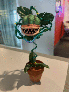 I have recreated Dionain-1 using beads, one for every animo acid that codes for the protein. The color scheme indicates what structures the amino acids fold into and is listed below. I added the straw for support and shaped the protein (with some artistic liberties) to hold the head of Audrey II. The head is polymer clay sculpted around a ping pong. Faux leaves were added to conceal the base and bring attention to the head.