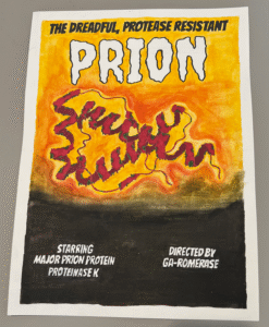 Major prion protein (PrPC) is a protein naturally expressed in the nervous system tissue of humans and animals. While harmless itself, a single amino acid substitution can cause it to misfold and become a prion (PrPSc). Prions, or “proteinaceous infectious particles,” are misfolded variants of major prion protein which cause several rare and fatal neurodegenerative diseases. They are infectious, with the ability to induce misfolding in other ordinary proteins. Some types of prion are resistant to action by proteinase K, an enzyme that cleaves peptide bonds, meaning that they are not readily broken down. As a big fan of the zombie genre, I drew immediate connections between prions and zombies. Prions’ ability to induce misfolding is similar to how a zombie bite can turn its unfortunate recipient into a zombie themselves. Their ability to mutate into a proteinase K-resistant form calls to mind the near-invulnerability of zombies in many films, books, and video games. I feel that if proteins were to make a monster movie, it would be about prions.
