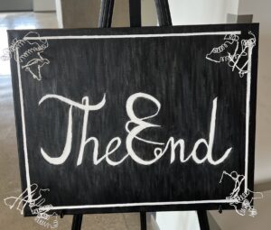 My portrait acts as the end credits in this film. Every protein has played their part in this production, so it’s only fitting to have end credits to accompany it. I was inspired by both my protein being the end as well as credits of old Hollywood movies. The font is inspired by the end title card in The Wizard of Oz. I painted in layers to give the painting texture. The frame around “The End” is inspired by the frames that adorn dialogue cards in silent films. Each corner of the piece has 3D sculptures of Transcriptional Repressor NrdR that are a part of the frame.