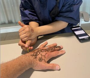 For this project, I chose to combine this protein with one of my favorite art forms, mehndi (also known as henna). The stain from mehndi arises from a chemical reaction (a Michael Addition, for those familiar with organic chemistry) between a chemical in the henna plant called lawsone and the keratin protein. This stain is technically permanent; the only reason why the stain fades over time is because the skin is shed. Similarly fading into the background, the keratin protein is playing an important role in our film as our makeup artist and hairstylist.