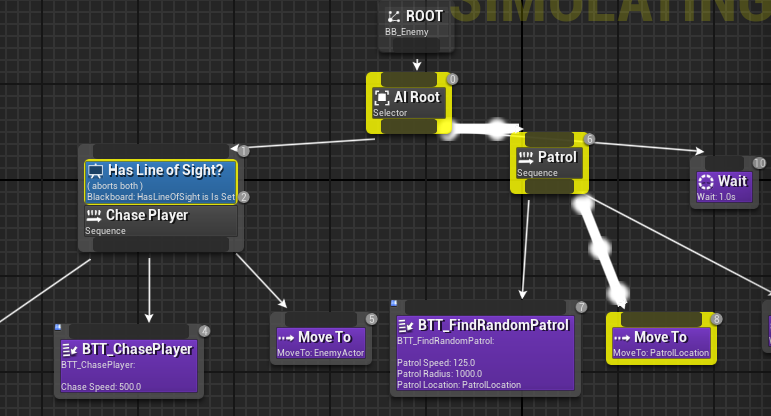 In this picture, we can see that my enemy AI is moving to PatrolLocation which is random location on the map. By using this feature, I could find that my enemy AI properly executes random patrol action, and it does not execute chase player action. It was obvious that “Has Line of Sight” has some issues or the HasLineOfSight value is not passing proper value for my Behavior tree. In this debugging phase, I promote a better understanding of the intersection of each blueprint and behavior tree in Unreal Engine 4. It was stressful to see my poor blinded enemy, but it was a good experience to learn things from my mistakes.