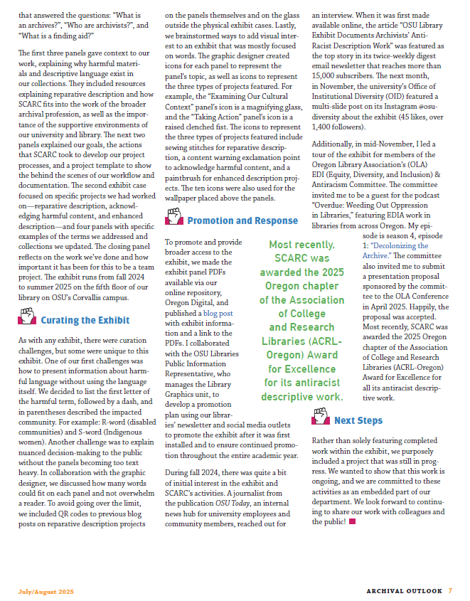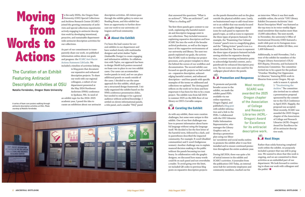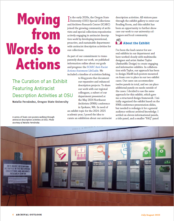 SCARC’s anti-racist descriptive activities were represented by Oregon Multicultural Archives curator Natalia Fernández at the National REFORMA Conference with a poster presentation titled “Moving from Words to Actions: Anti-Racist Description Projects of Archival Materials Pertaining to Oregon’s Latinx Community History.”
