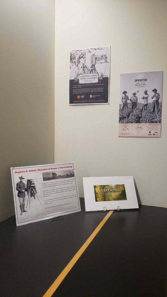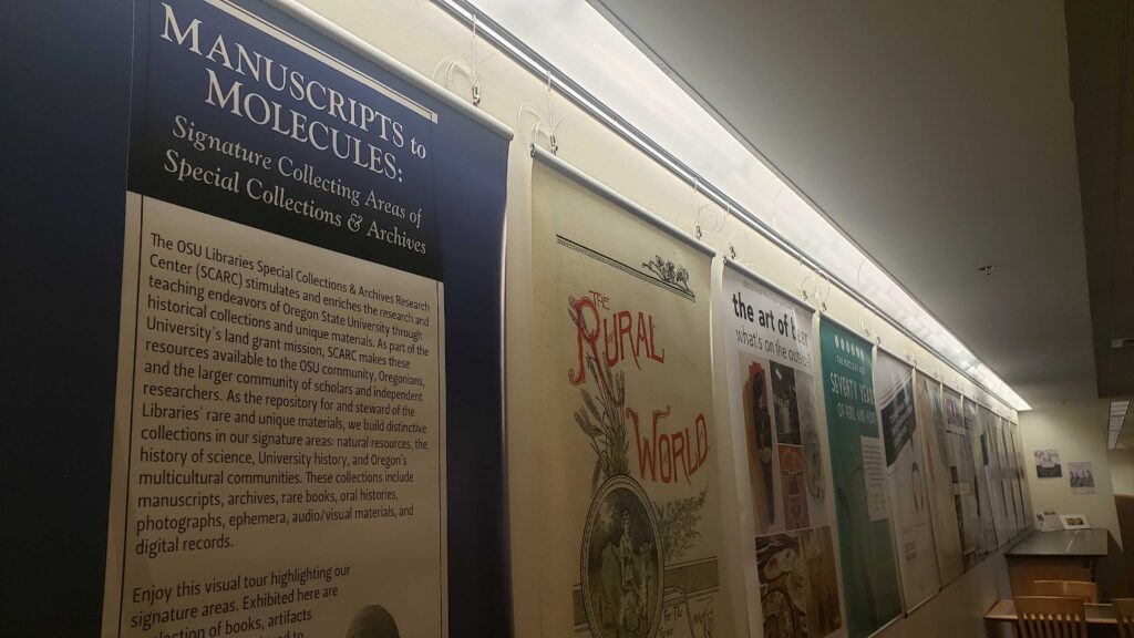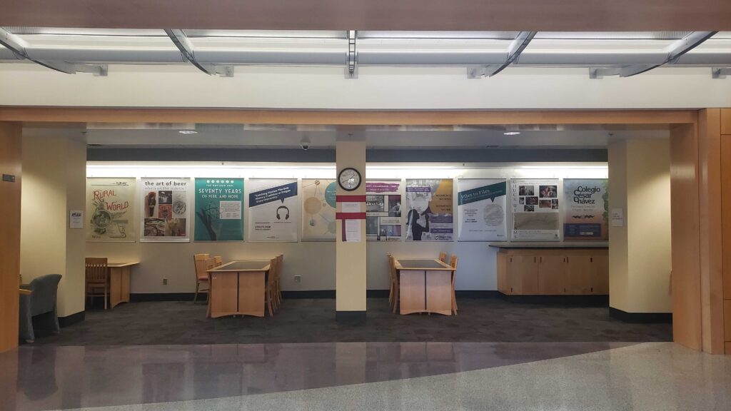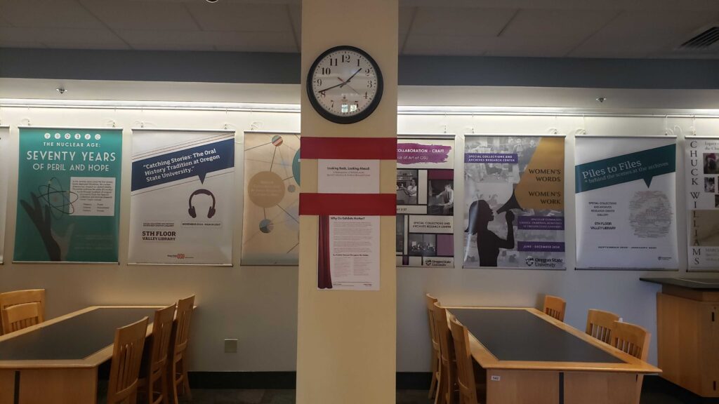 As a complimentary exhibit to “Looking Back, Looking Ahead: A Retrospective of Exhibits in the Special Collections & Archives Research Center” featured in the SCARC Exhibit Gallery, the exhibit alcove features the title posters of the 18 exhibits we have hosted since 2012.
