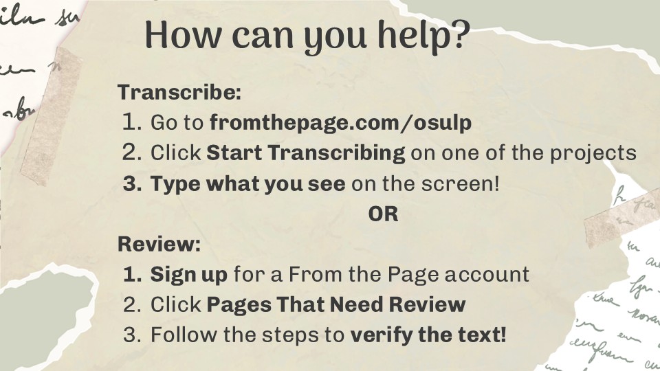 The OSU Libraries, in collaboration with SCARC, hosted its first Transcribe-a-Thon Event via the From the Page platform!