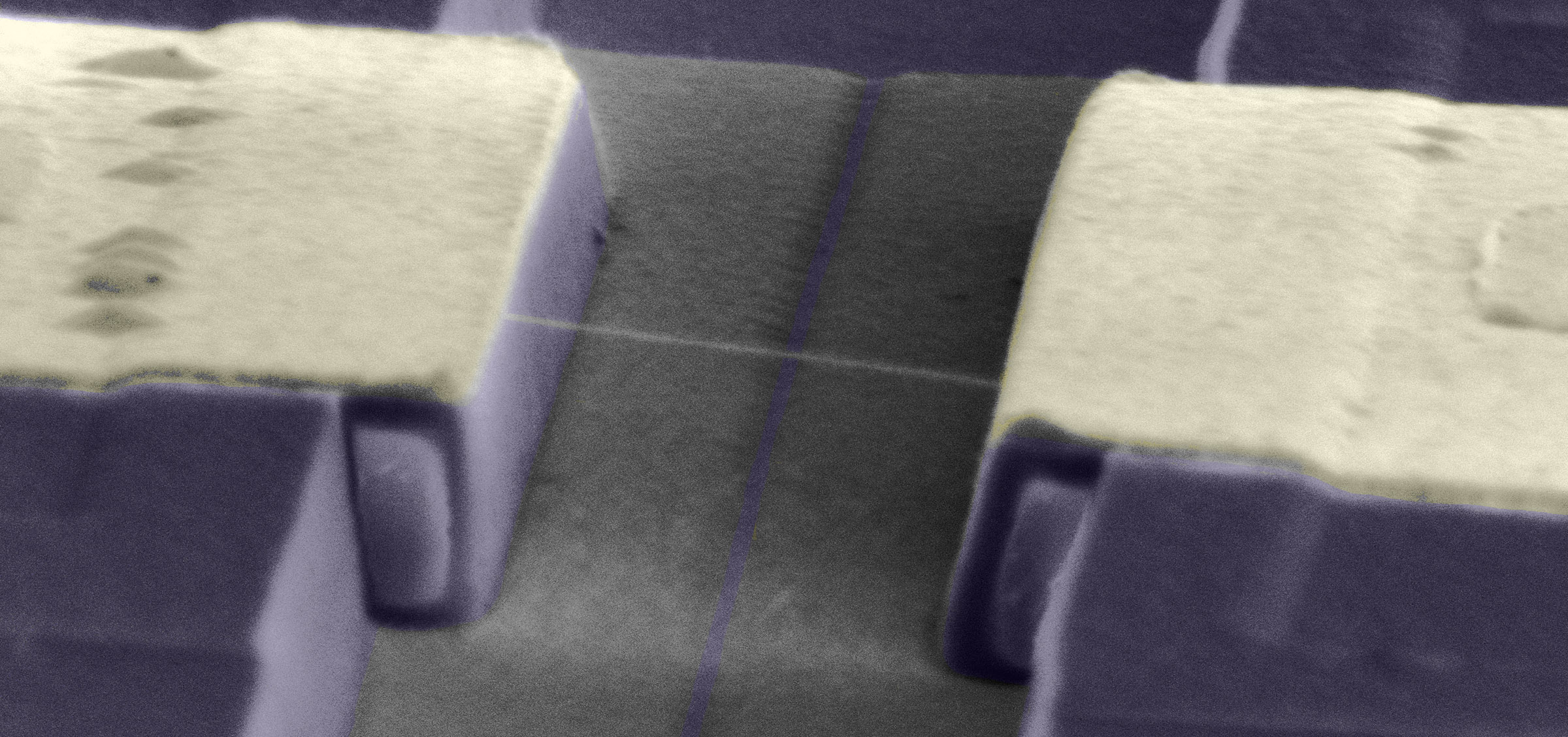 Scanning electron micrograph of a carbon nanotube (white filament) connecting metal electrodes (shaded yellow).