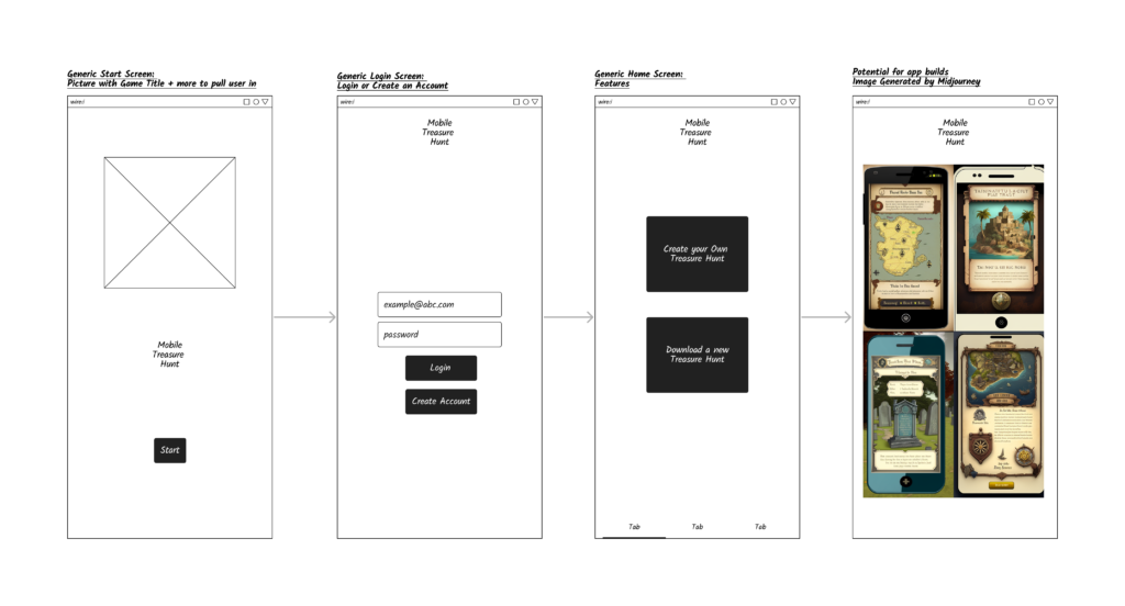 In order to keep some uniformity to make comparisons for our research, each application will have three main agreed-upon screens. We will each build in the following screens: a Start Screen to pull users in, a Login Screen, and a Home Page conveying the two main features of the game: create your own treasure hunt or download a treasure hunt. After these three main screens, ChatGPT will lead the way and inform us how to build out the rest of the application(s).
