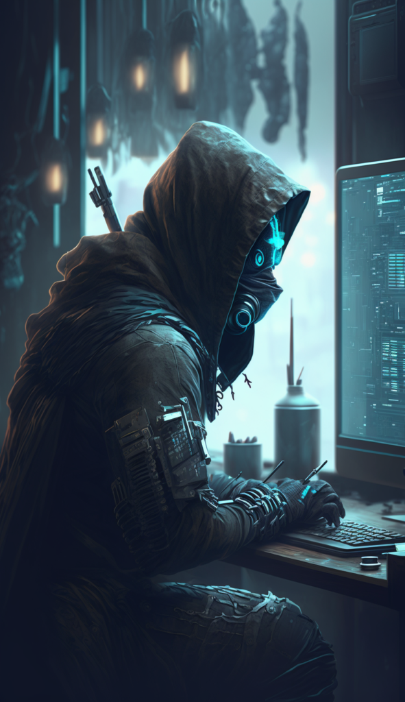“a coding ninja working at his computer station, cyberpunk, artstation, 8k octane render, unreal engine, very detailed, concept art, realistic, masterpiece, sharp, rule of thirds –ar 9:16“