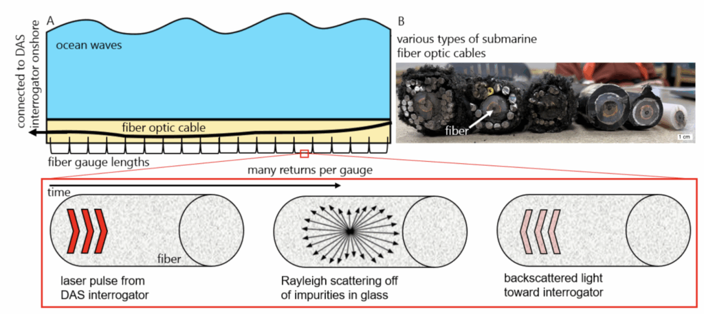 Usually pressure is measured with individual, self-contained sensors that are buried in the sand. These types of measurements give information about a single location across the beach and are time/labor intensive to install. Distributed Fiber-optic Sensing is a type of technology that provides a measurement of the environmental conditions at many locations along a fiber-optic cable, such as a telecom cable. Distributed Acoustic Sensing (DAS) is a type of fiber-optic sensing that has recently been used to measure pressure from waves in the ocean. A DAS instrument attached to one end of a fiber-optic cable continuously records the strain on the cable at many locations. This cable strain is generated by vibrations and pressure signals from physical processes, including waves. Measurements of cable strain can be continuously collected every meter for 10s of kilometers, providing a significant improvement in the spatial resolution of pressure measurements. This work is funded by NSF (https://www.nsf.gov/awardsearch/showAward?AWD_ID=2407466&HistoricalAwards=false).