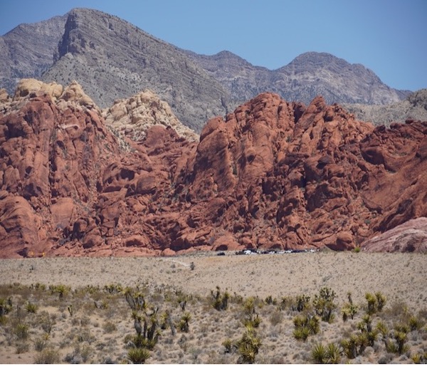 This picture of the first pullout at Calico I captures the dynamic between the gray limestone mountains and the ancient Aztec sandstone that makes up the Red Rock Canyon area. If you take a close look above, the cars at the foot of the mountain shows you the scale of the giant boulders. Calico I pullout gives visitors the opportunity to take pictures or gain access to the red rocks for a climb.